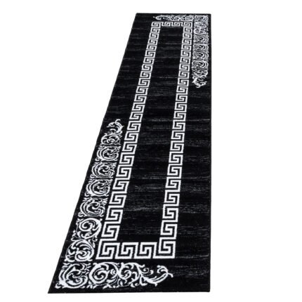 Kurzflor Teppich, Mäander-Design, Farbe Schwarz, Teppich für Wohnzimmer, Rücken aus Jute, Größe: 80 x 300 cm