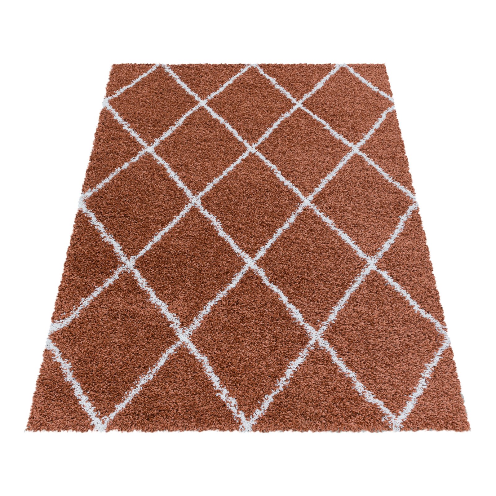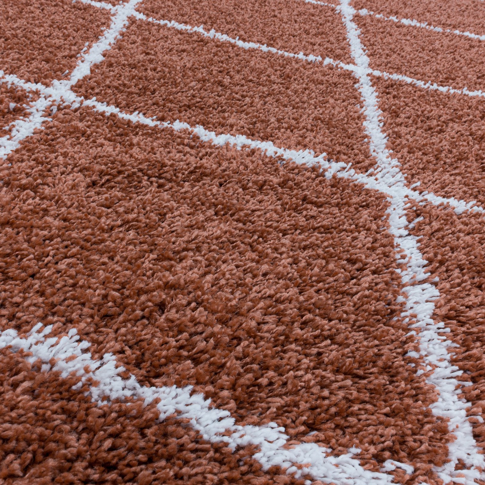 Hochflor Teppich, Geometrisch Design, Farbe Terrakotta, Teppich für Wohnzimmer, Rücken aus Jute, Größe: 60 x 110 cm