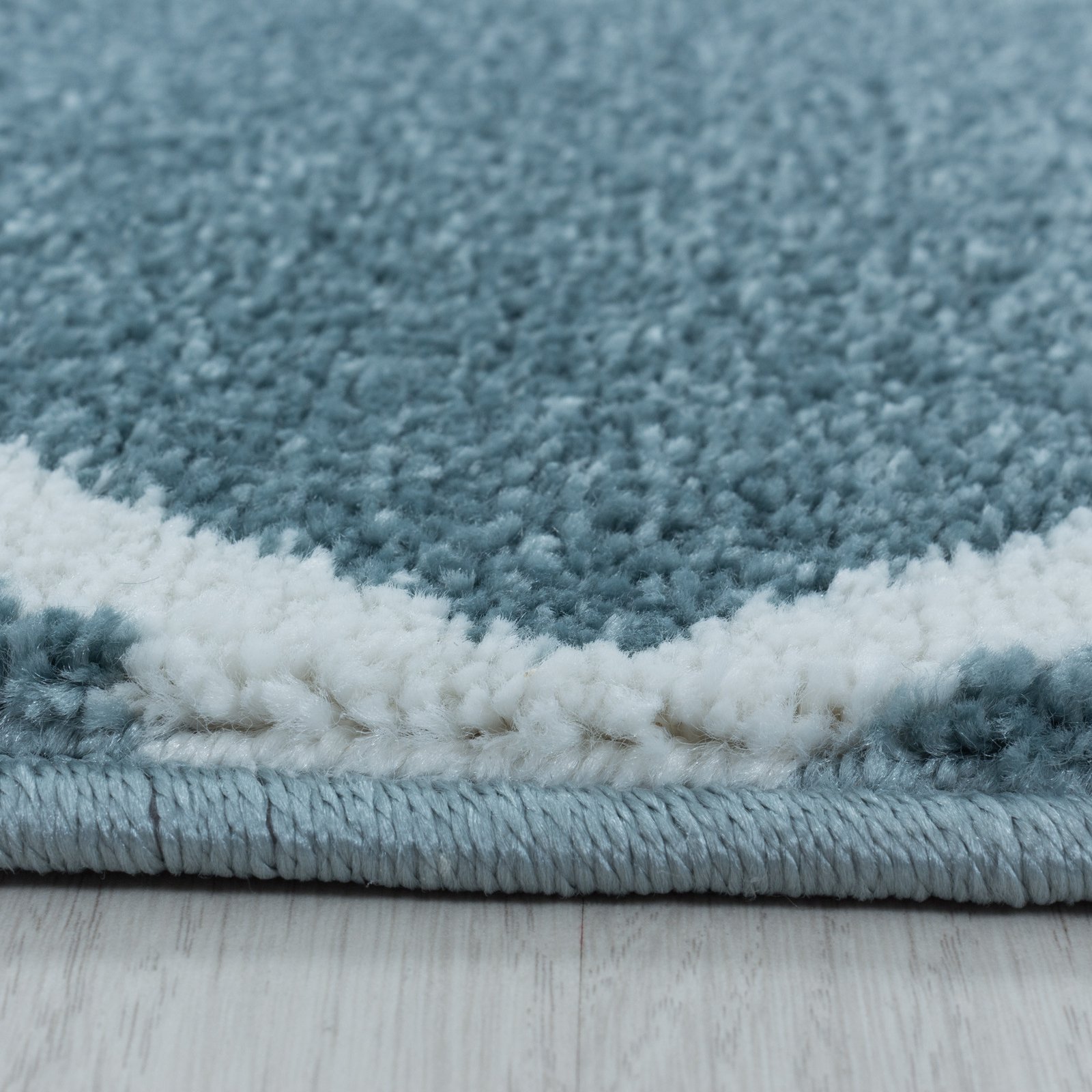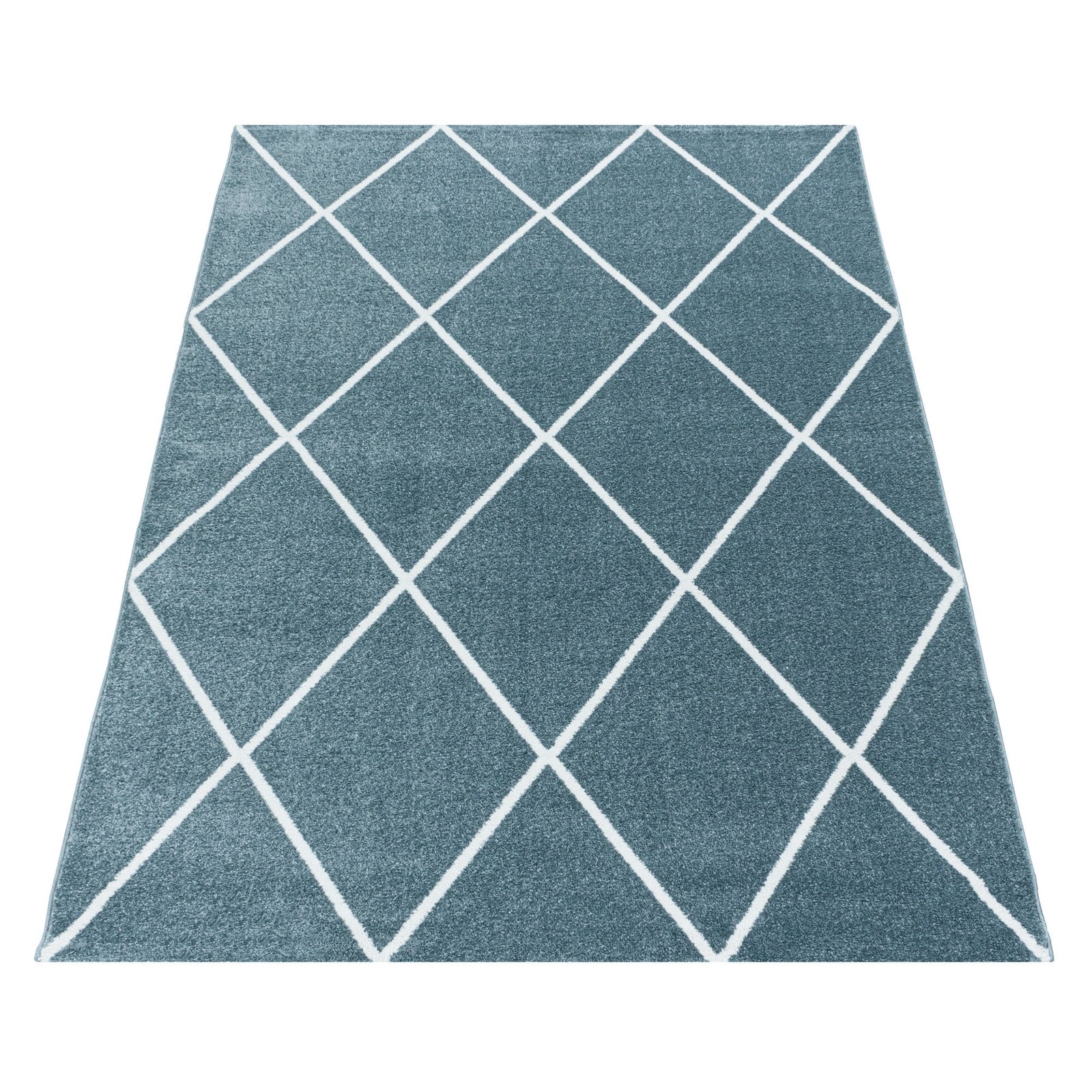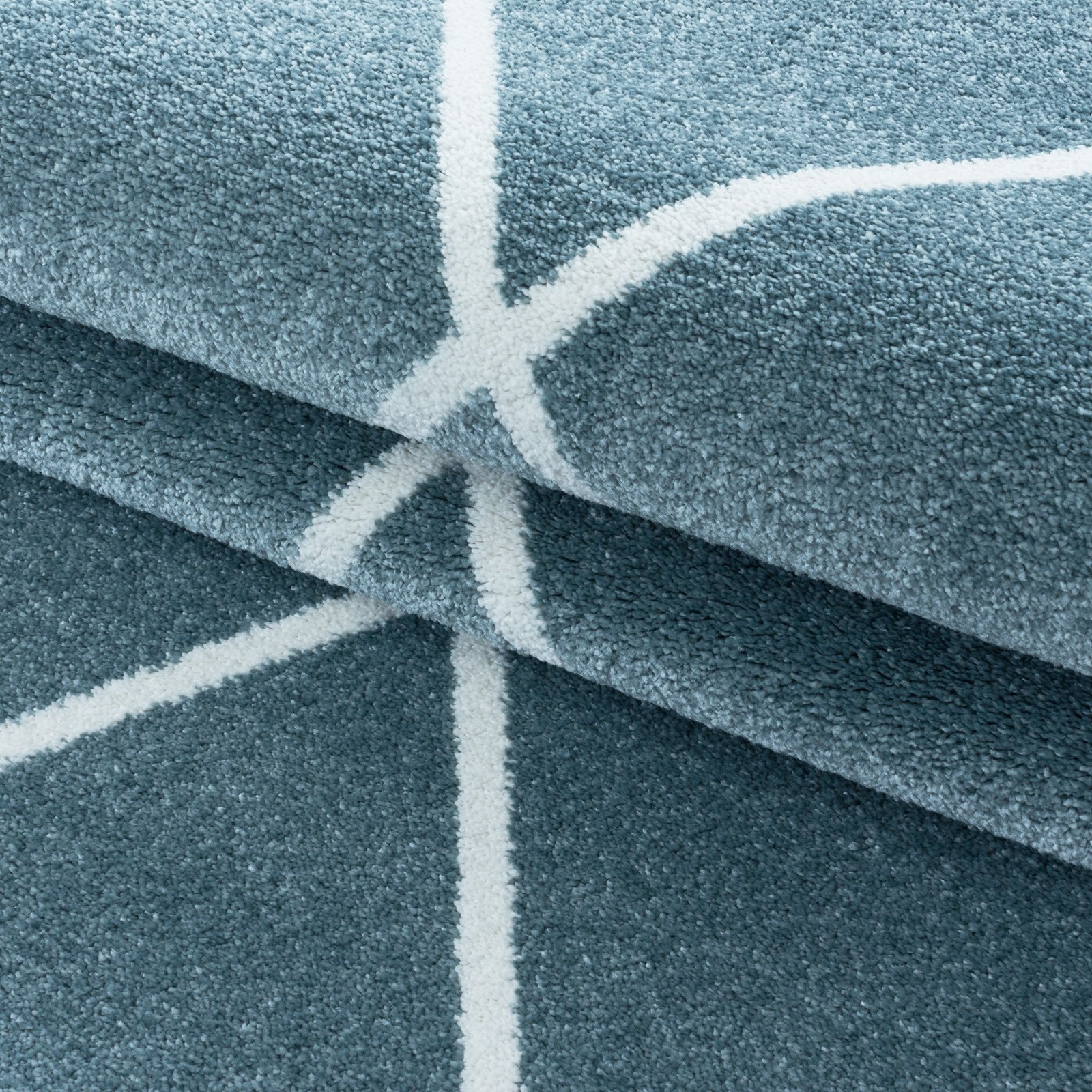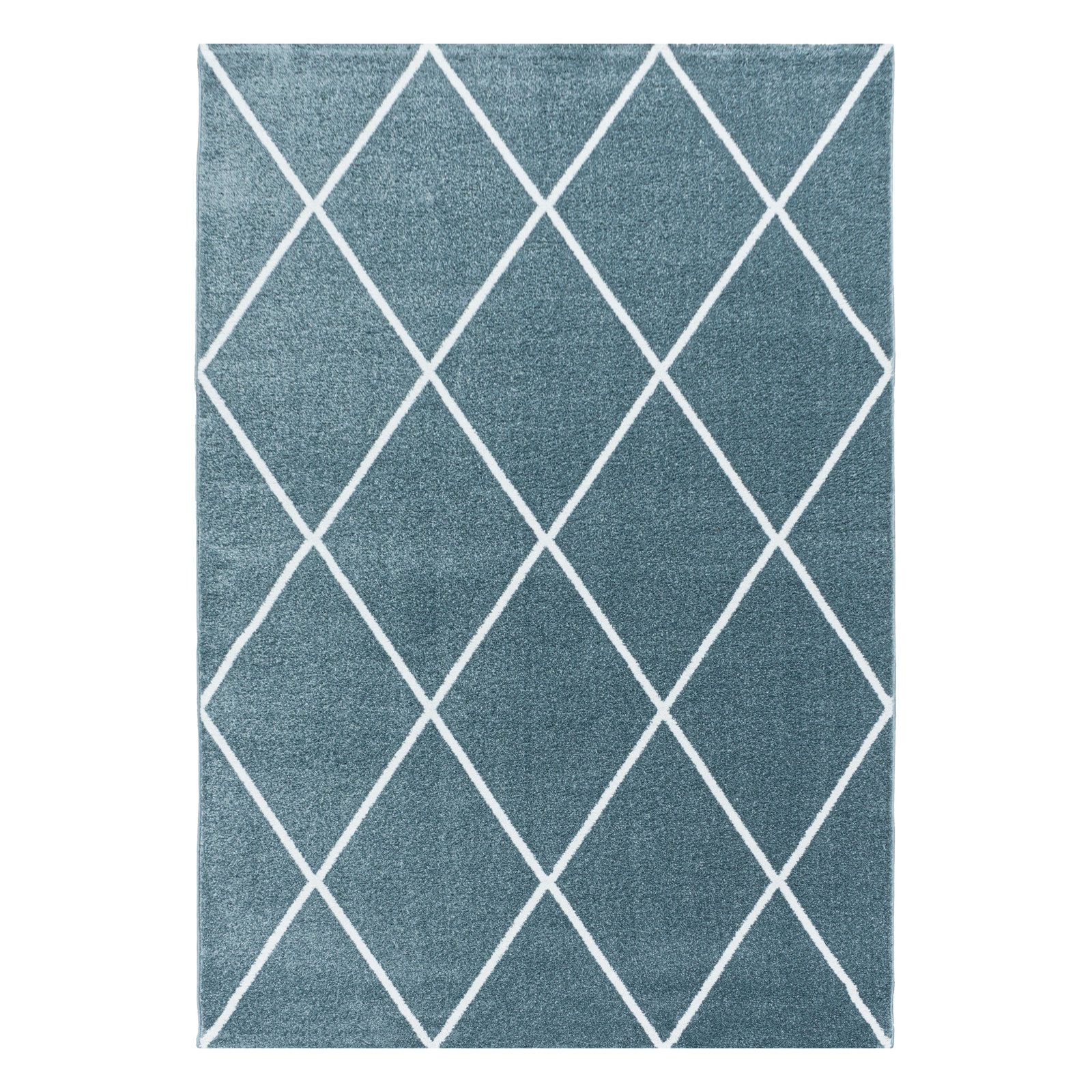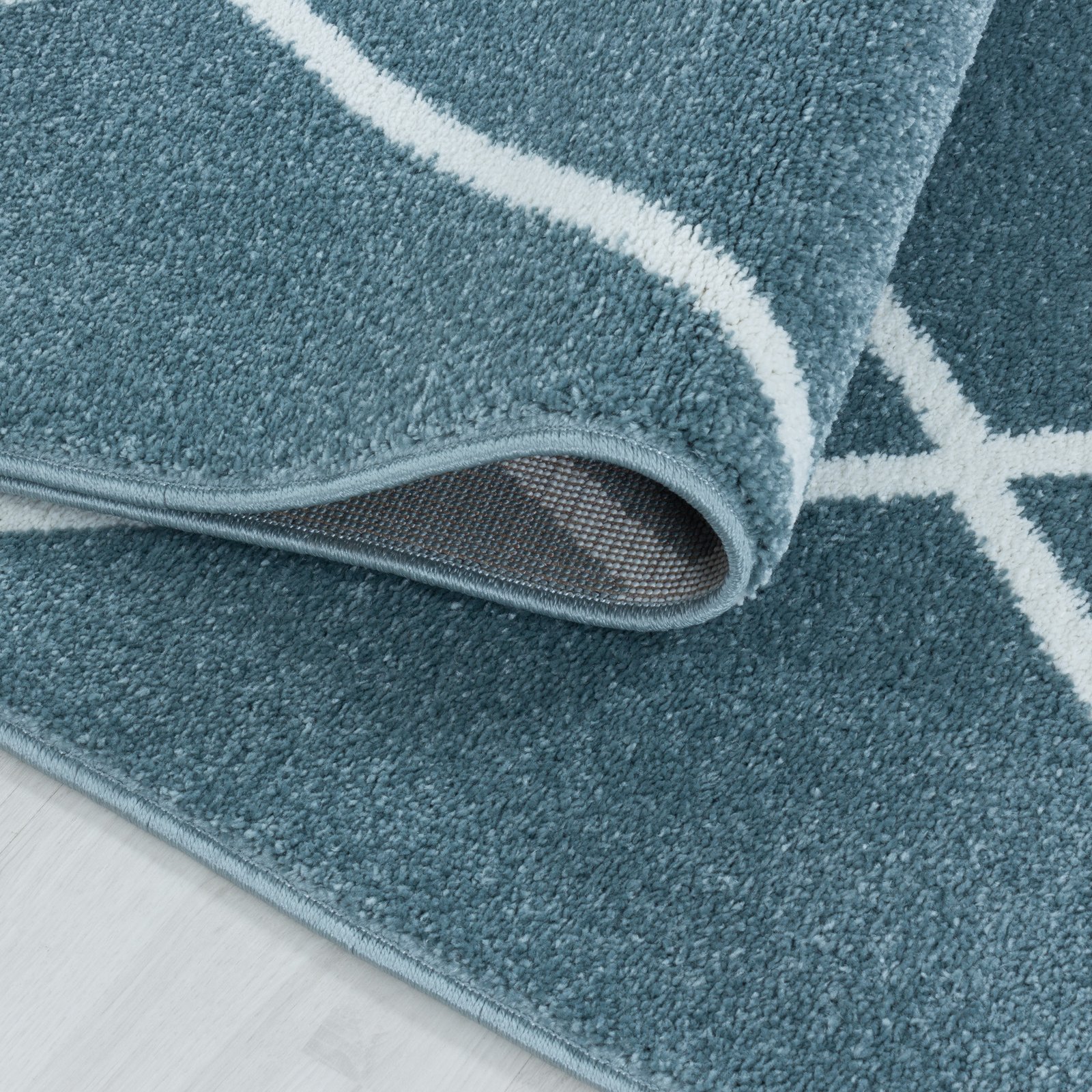 Kurzflor Teppich, Geometrisch Design, Farbe Blau, Teppich für Wohnzimmer, Rücken aus Jute, Größe: 80 x 150 cm